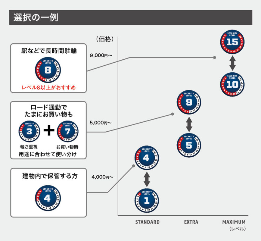 ケーブルロックなどのLEVEL2のものから、最高強度のLEVEL15までラインナップ。