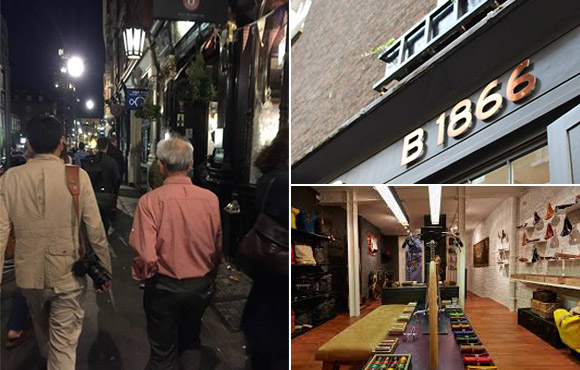 到着したホテルから歩いて、もうそこにBROOKS直営店、古い石造りのビルの並び、歩道を歩いて程なく、入口の頭上に書かれた金色のB1866文字、ここだ!
