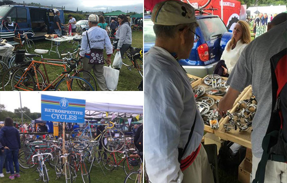自転車を介してのお祭りにこれほどの規模とは、入口から何列も奥に、用品、アクセサリー、衣料、パーツなど、それぞれテントの下に並べられている。