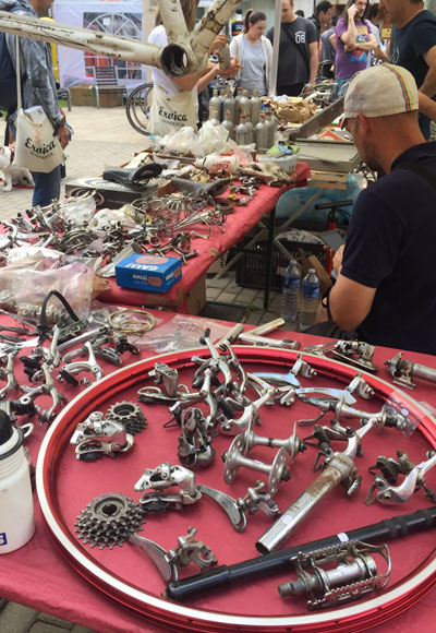 ヴィンテージパーツや、オフィシャルのウェア等のブースが並ぶ。 ビールやワインを飲みながらのんびりとした時間が流れる。