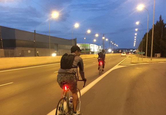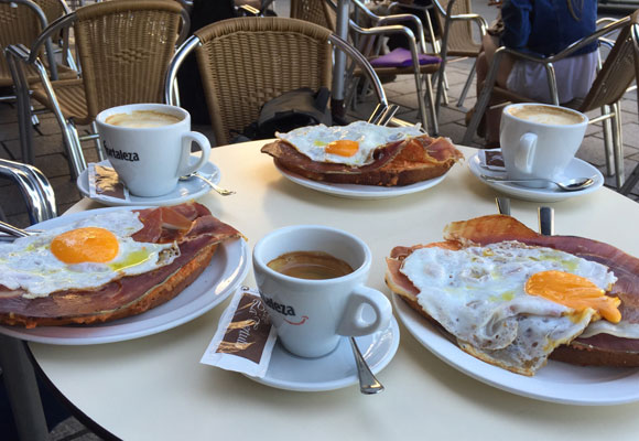 どんどん楽しくなり、もっと深くに行ってみたいと思うが、まずは朝飯を食うぞという事になり、 街に入ってすぐにあった、うまそうなハムののったパンを食べに街の入り口まで戻る。 そして、このお二人は自転車とコーヒーと。というFacebookページを運営されているそうで、コーヒーはこの旅には不可欠だそう。