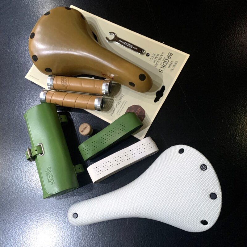 サドルとグリップ、バッグとテープ、バイクカラーに合わせたサドルカラー