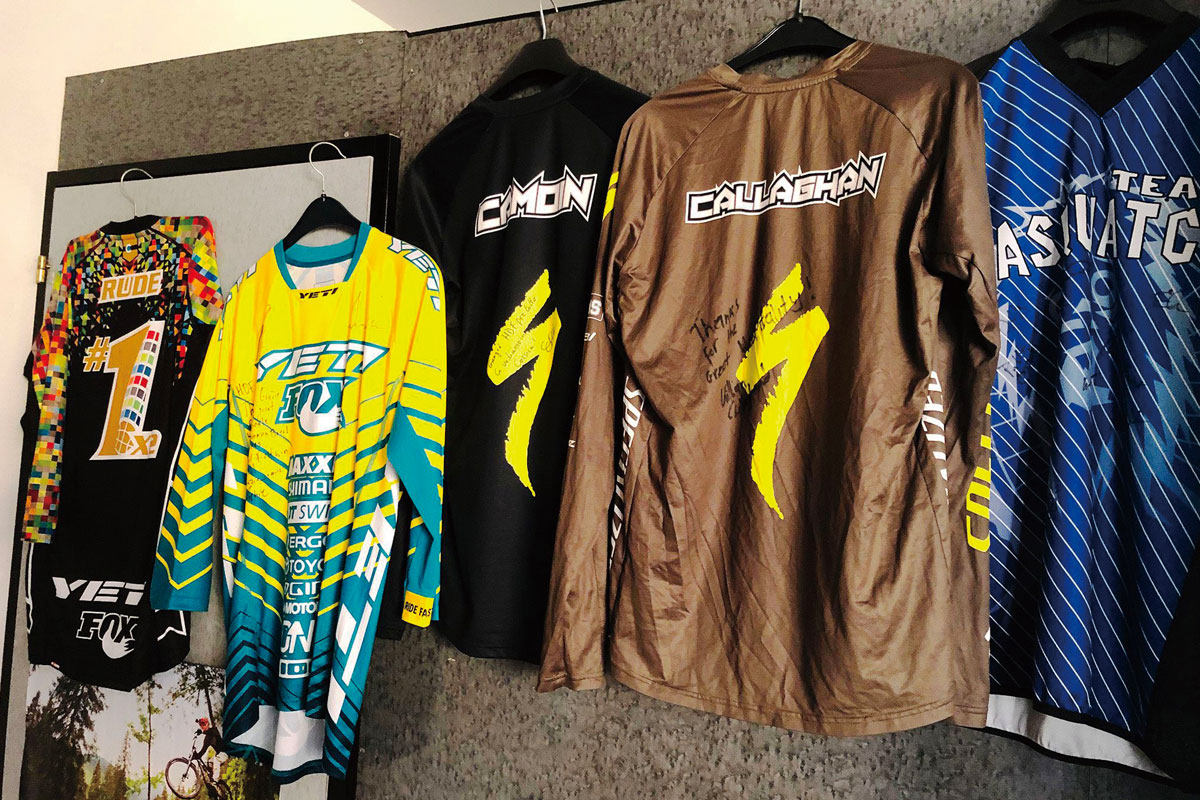 壁を彩るこのトレイル・マップと吊り下げられている幾つものジャージを見てるだけでワクワクする。
