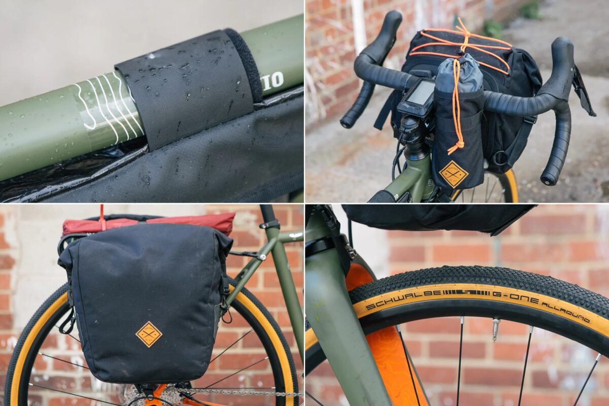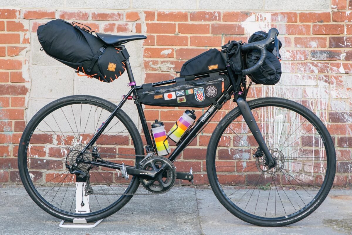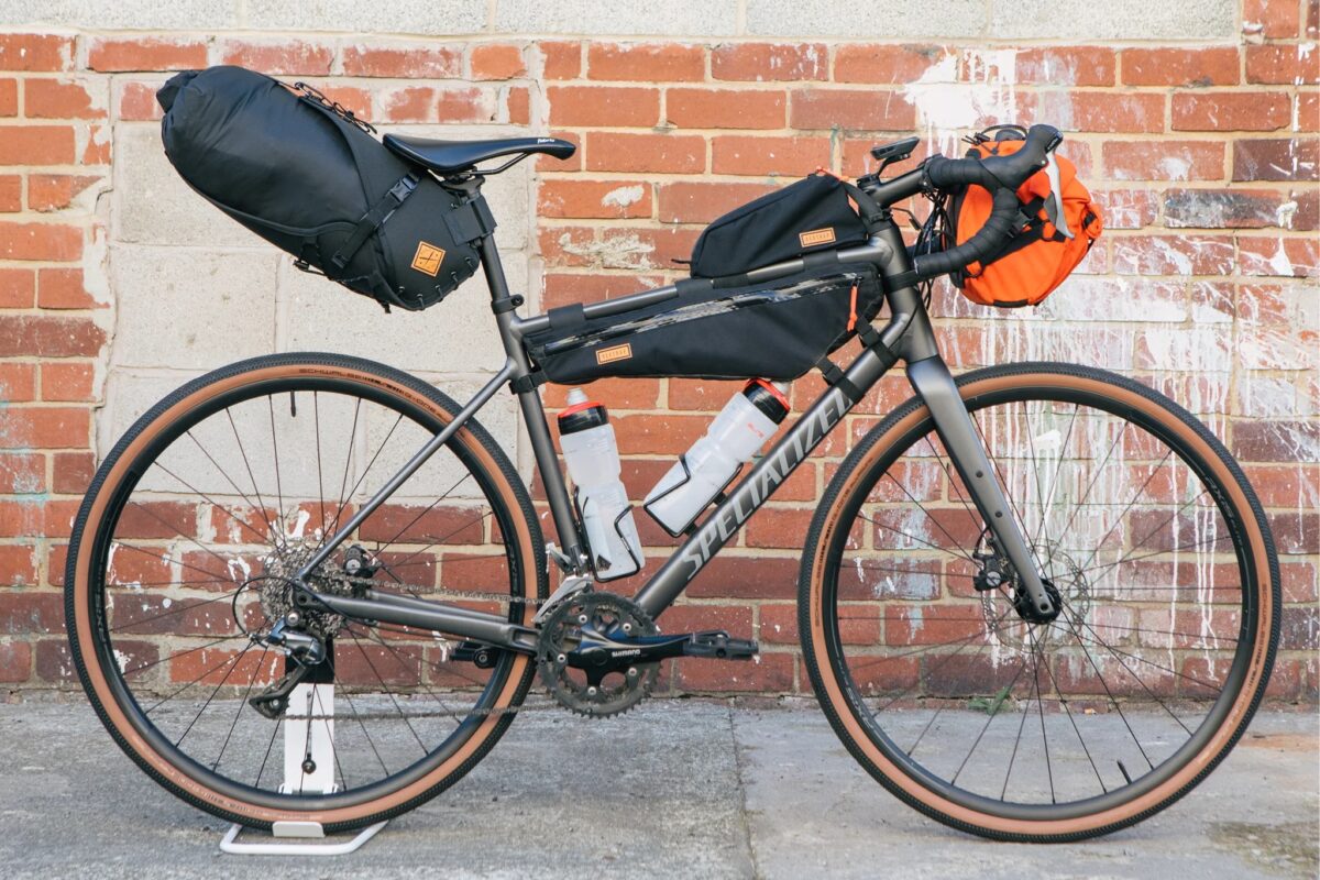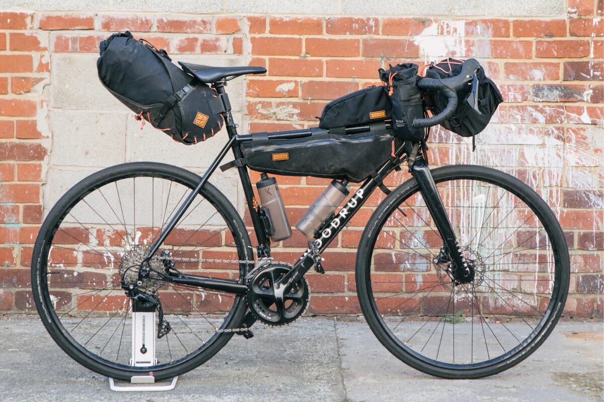 BIKEPACKING BAGS: Bar Pack, 14L saddle bag, Large Frame bag, top tube bag.
