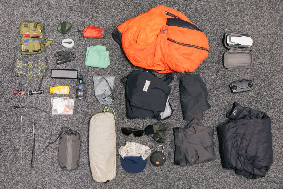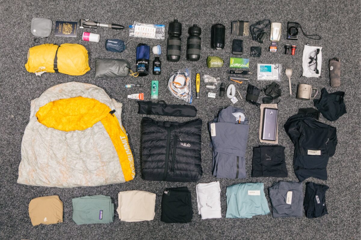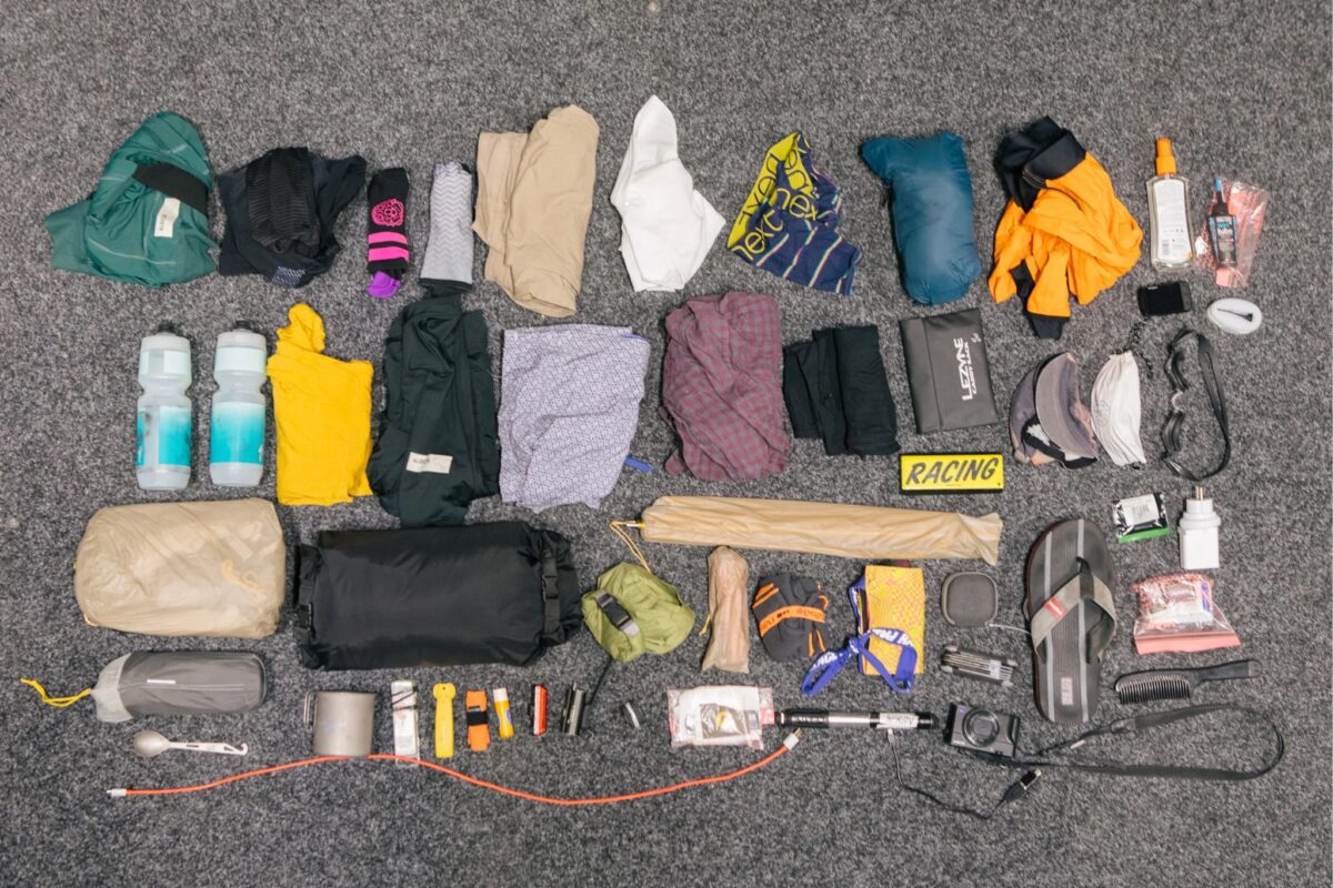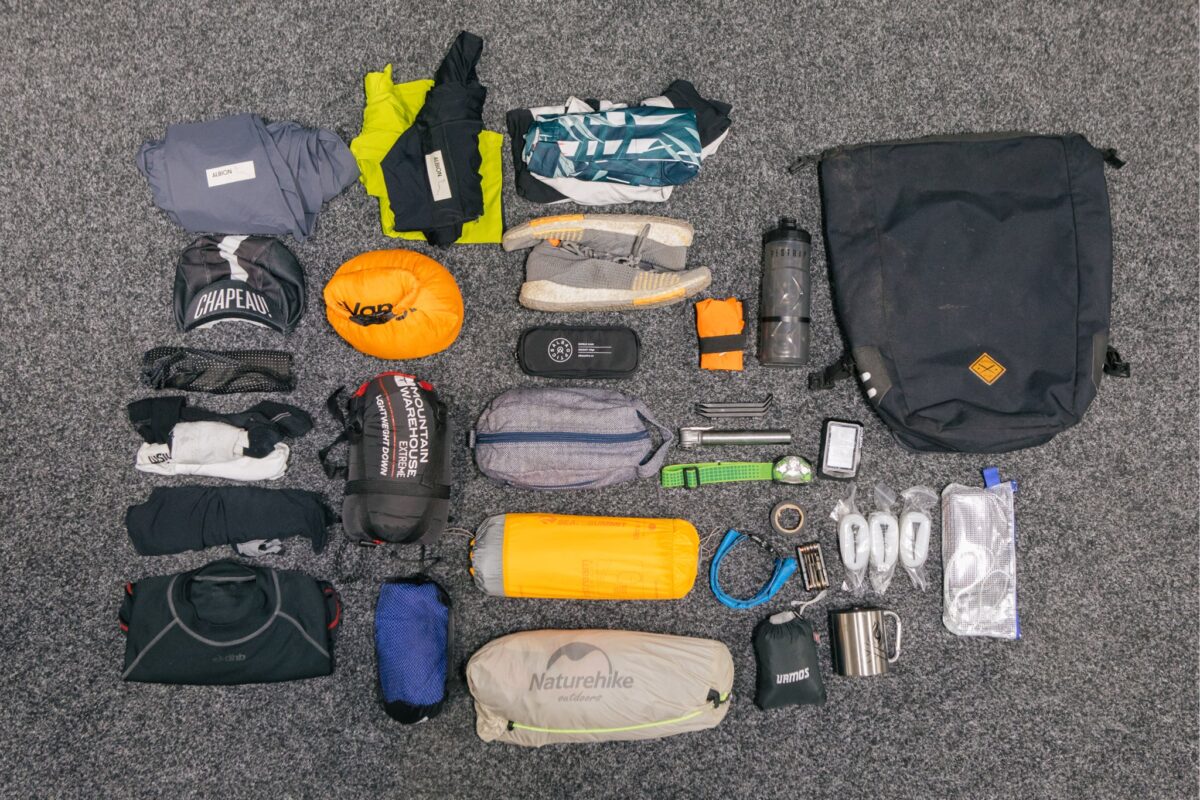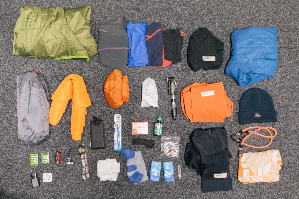 ボトル×2、ツールボトル、LEZYNE 防水ポーチ、チタンマグカップ、救急セット、 サイクリンググラス、サコッシュ、洗面用具、高速充電器&変換プラグ、SPF30 日焼け止め、SPF15 リップクリーム、Restrap FAST STRAP×4、マイクロファイバータオル、カードケース、イヤホン、予備のカメラバッテリー、バッテリーバンク、スプーンフォーク、充電ケーブル