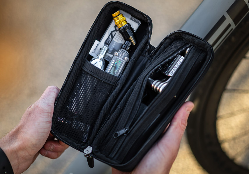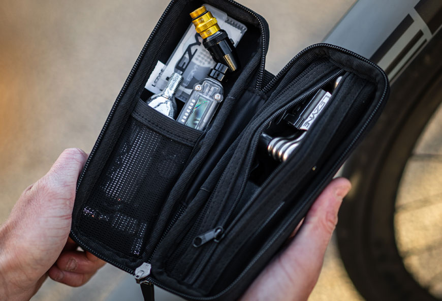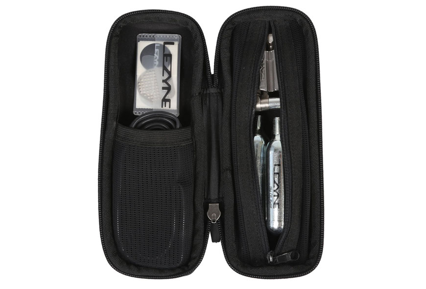 内部は、便利に収納できるよう、各コンパートメントに分かれており、マルチツールやハンドポンプ、CO2ボンベやチューブ、パンク修理キットなどを傷つけずに納められます。