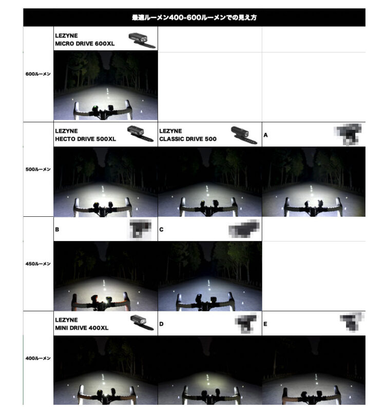 最適ルーメン別各社の照射比較テスト