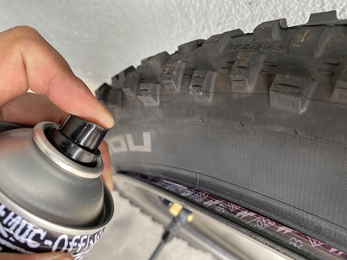 他にも、MUC-OFFのSILICON SHINEをビード部分に吹きかけることで、すんなりビードが上がりやすくなります。上がった時のパン!というあの怖い音も軽減。