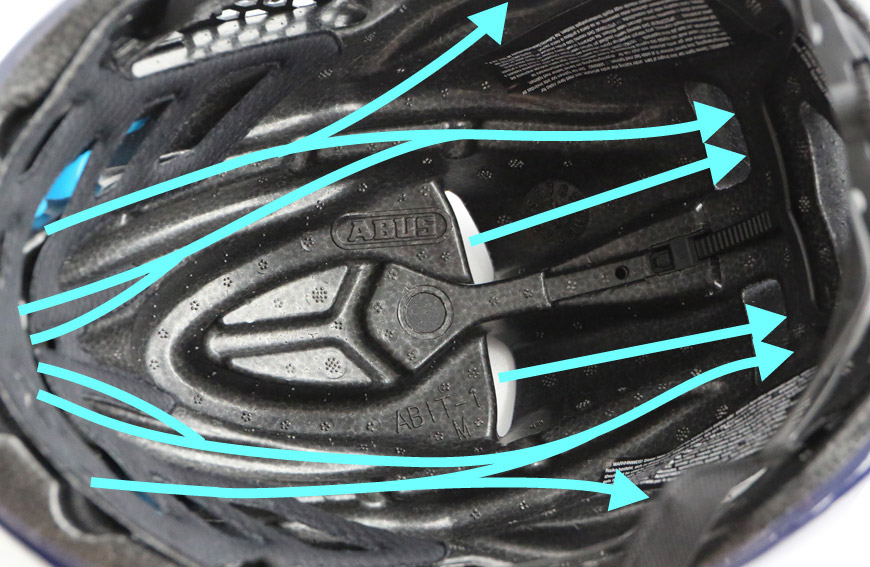 ヘルメット内部前方から入ったエアーは、シェルに設けられた4本の大きな溝に沿って後方へ流れます。そして上部の2つのエアベントからもエアが流入し頭部をしっかりと冷却。