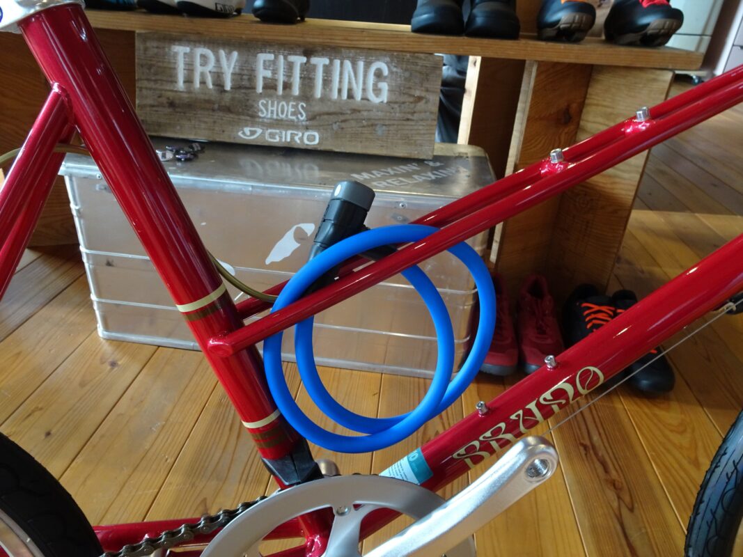 ダブルトップチューブのバイクには、ストレートケーブルロックをその間に挟むという方法が。