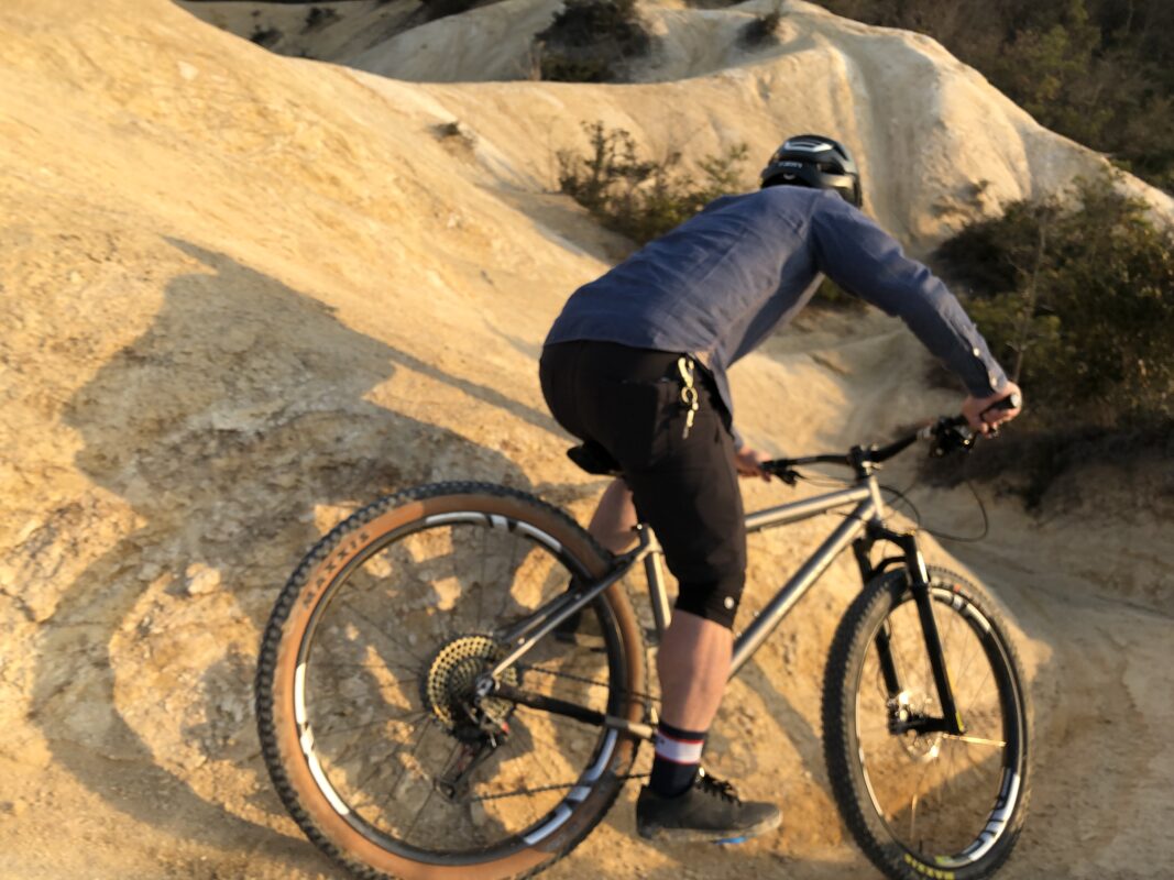 後ろ荷重気味にスタンディングでのダンシング、ハンドルを右に左に振ると、フッフッとフロントタイヤが軽く浮かせられる。