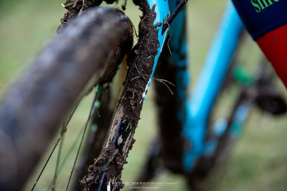 まず最初にすることは、ピットに入ってきた自転車の泥を落とす作業。