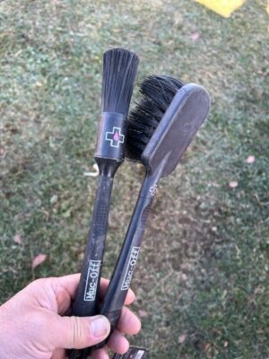 洗車後気になる汚れがある箇所はHP QUCIK DRYING DEGREASERで汚れを吹き飛ばし、DRIVE TRAIN BRUSHとSOFT WASHING BRUSHを使って汚れを落とします。