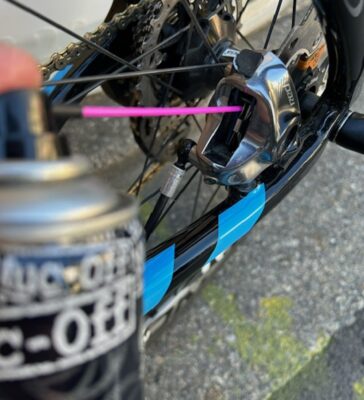 ディスクブレーキクリーナーはブレーキパッドの装着部に泥が詰まっている事が多いので、パッド側から噴射します。