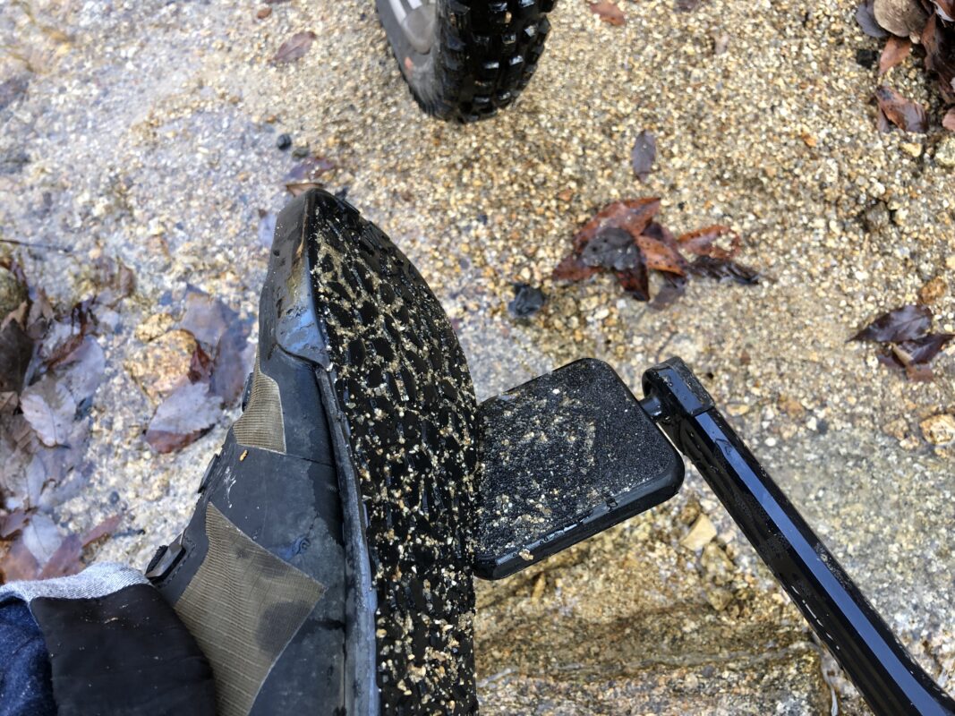 ただし、画像のように砂利が噛むような状況と、泥がシューズの裏に付く状況は苦手のようです。