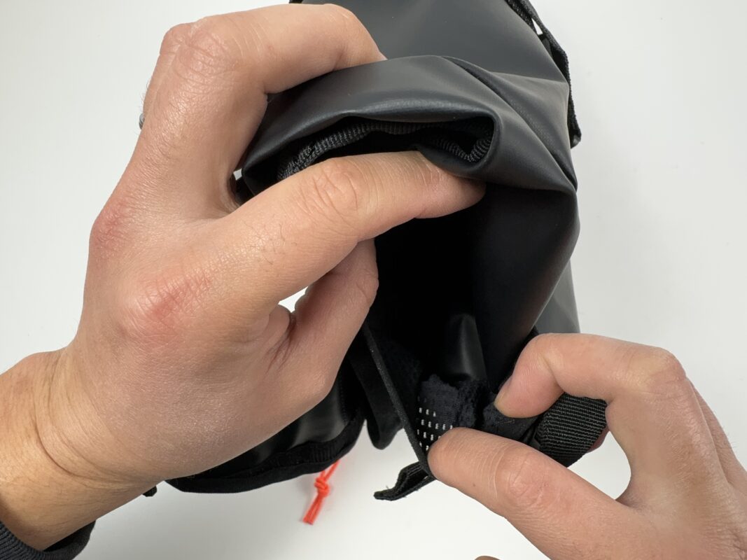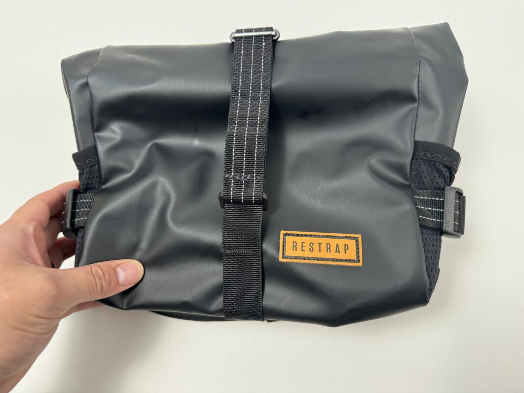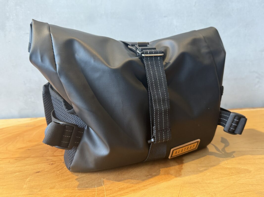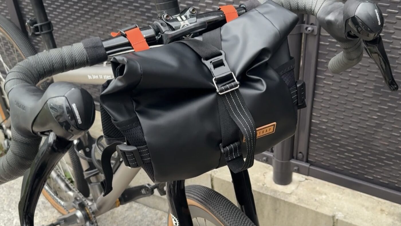 また、バッグを潰せるストラップがあるので、振動が心配なときはギュッと縛ってしっかり固定ができます。