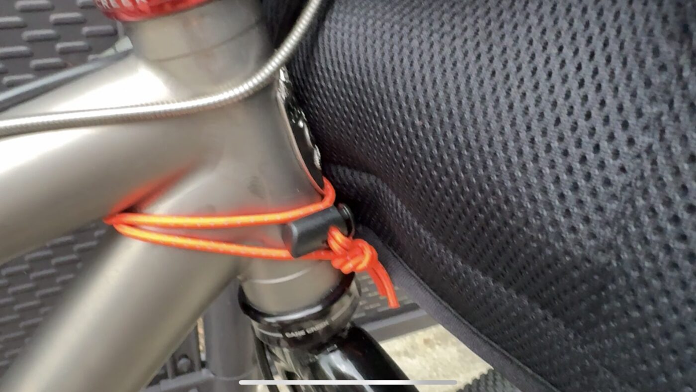 上部にあるオレンジのストラップでハンドルバーに固定、下面のストラップでヘッドチューブに固定します。