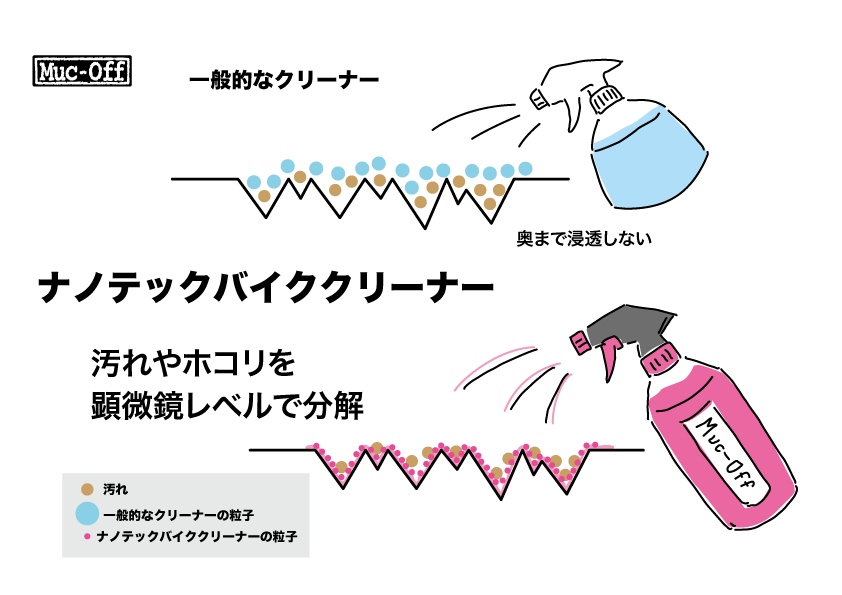 スプレーした後、2〜3分ほど放置すると、ナノテックバイククリーナーの成分が汚れの内側に浸透、