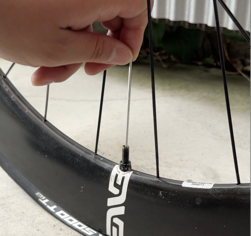 竹串のような細長い棒をタイヤの底につくまで差し込みます。