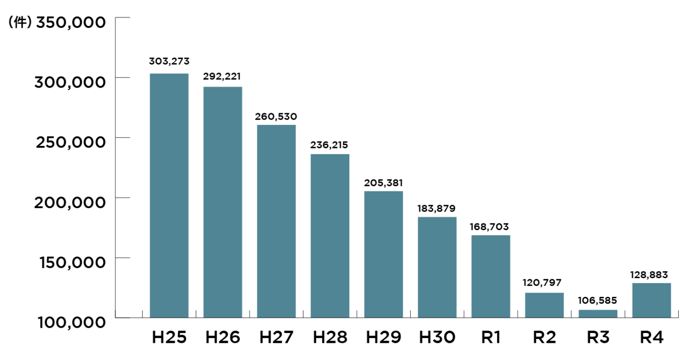 2021年まで9年間くらい減少傾向で、22年で再び増加(前年比2万件以上)