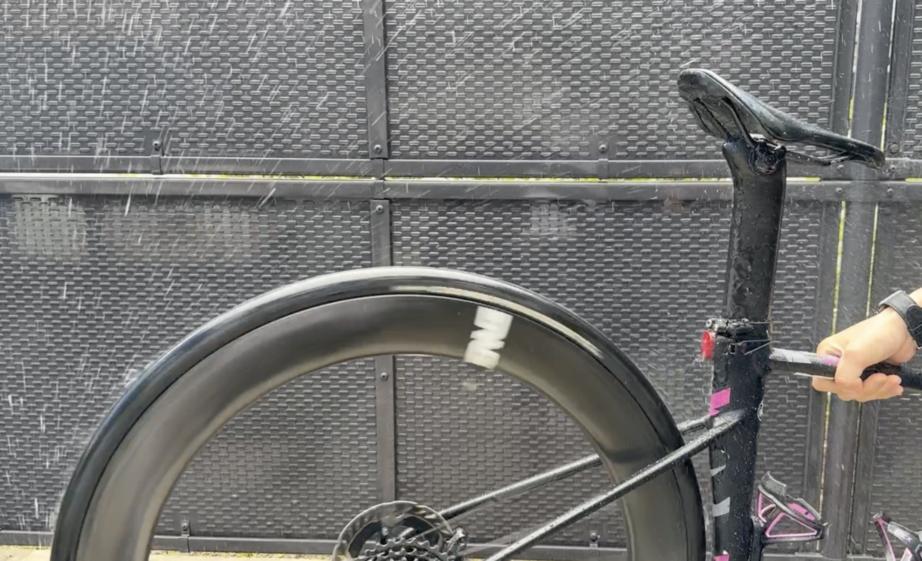 ホイールに水をかけながら回して、どの方向に水が飛ぶのか検証。