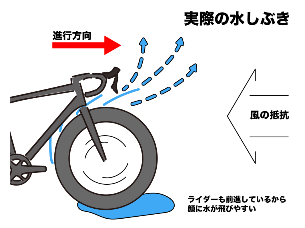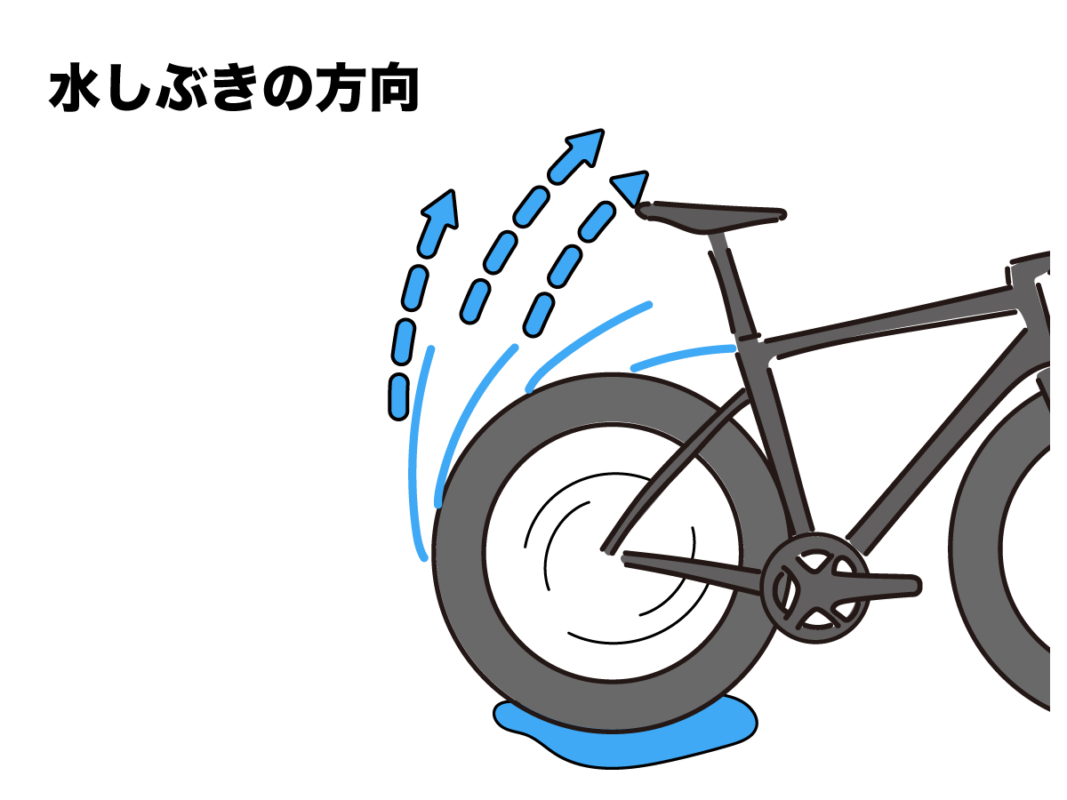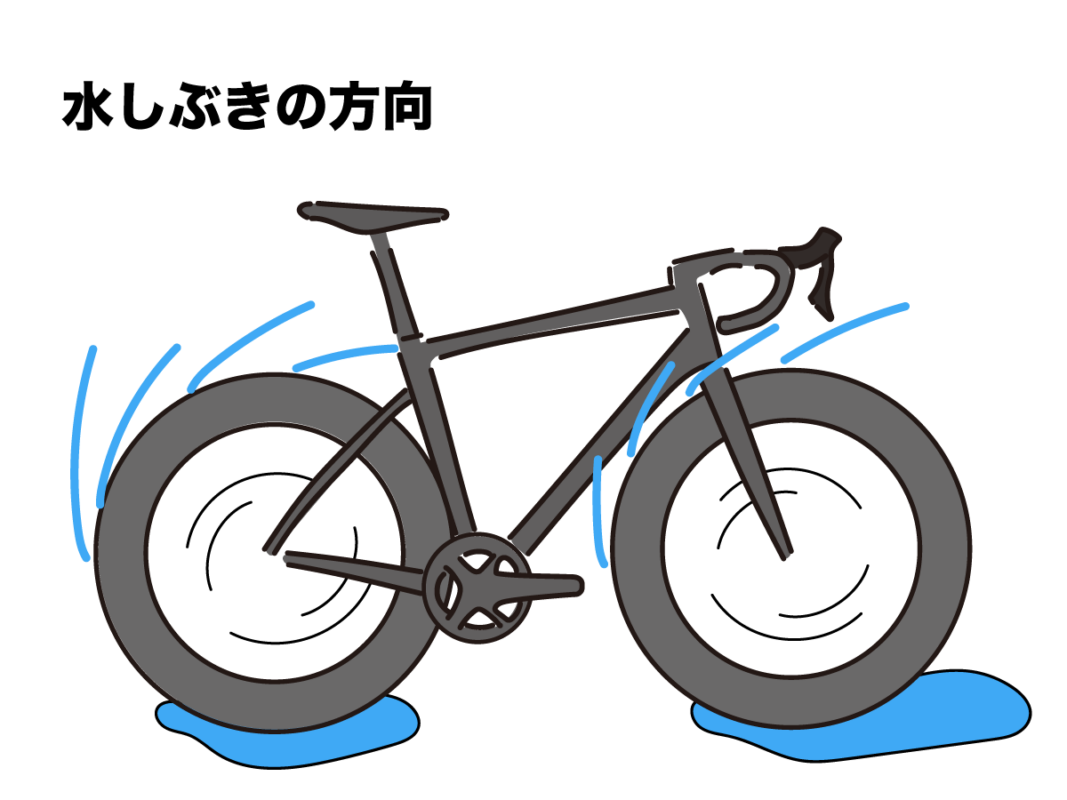 前輪はその後、自転車(ライダー)が迫ってくるので、水しぶきをもろに受けてしまうことになります。