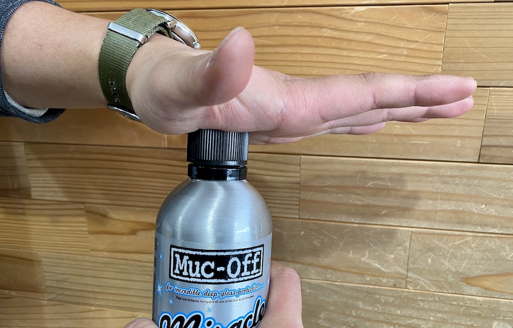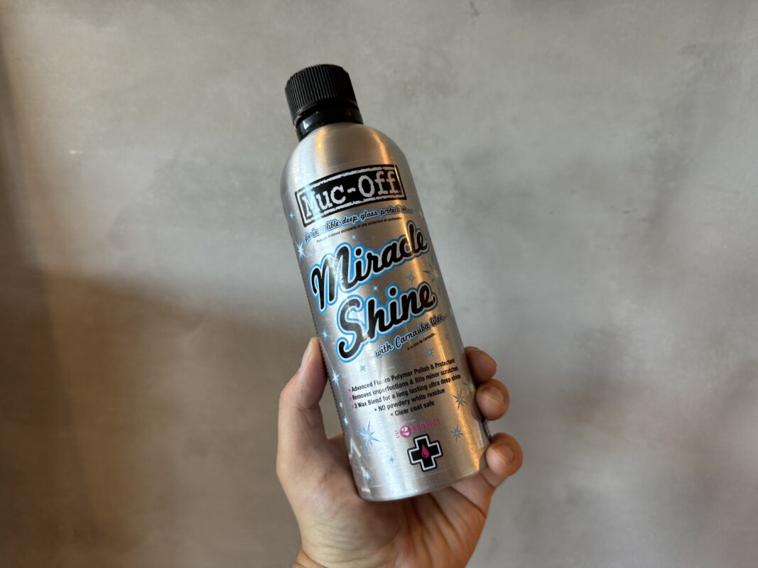 まず、フレーム全体をWATERLESS WASHなどで洗浄したうえで、MIRACLE SHINEを全体になじませます。