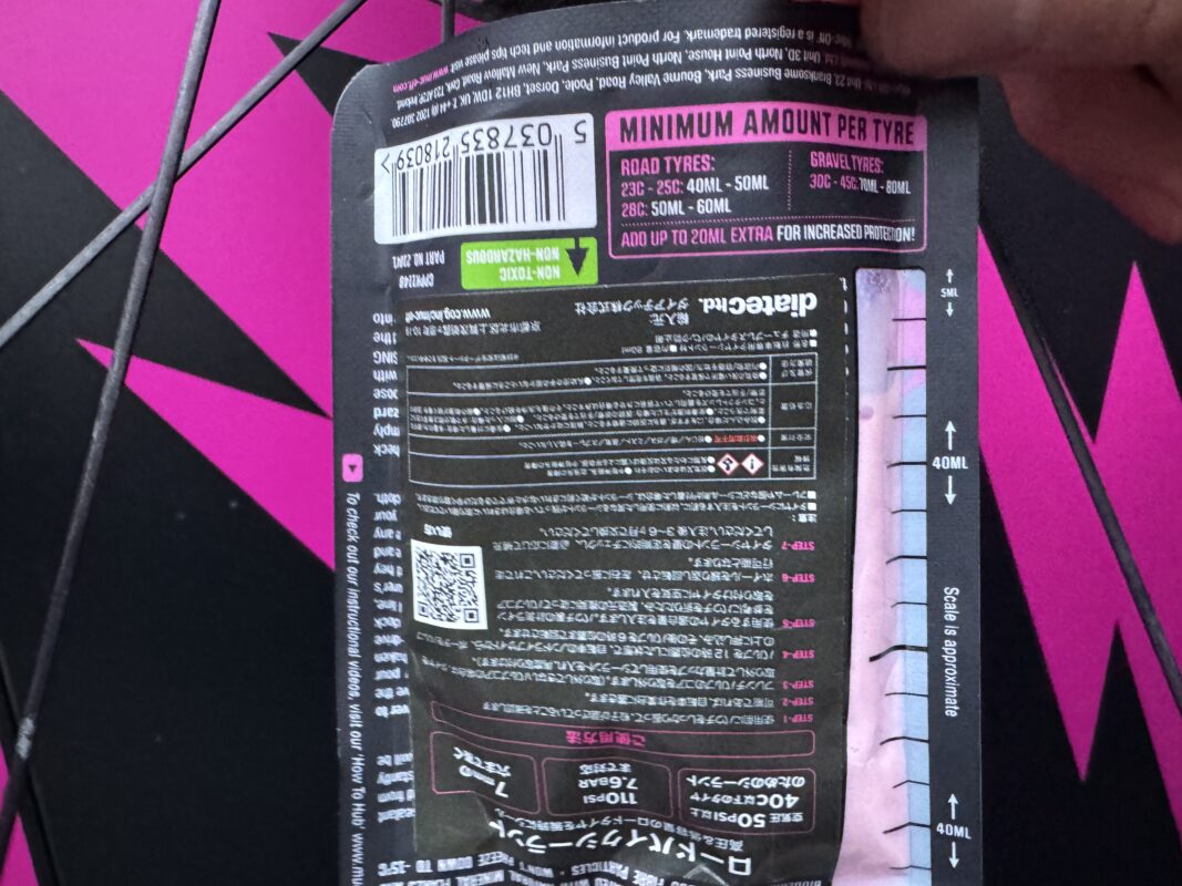 昨今のロードタイヤは徐々に太くなってきており、30cであればタイヤ1本につき80mlパウチを丸ごと入れられるので、計量せずに済みます。