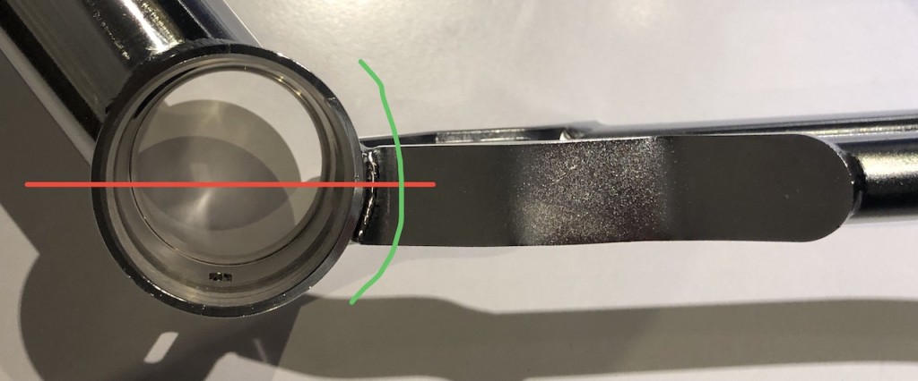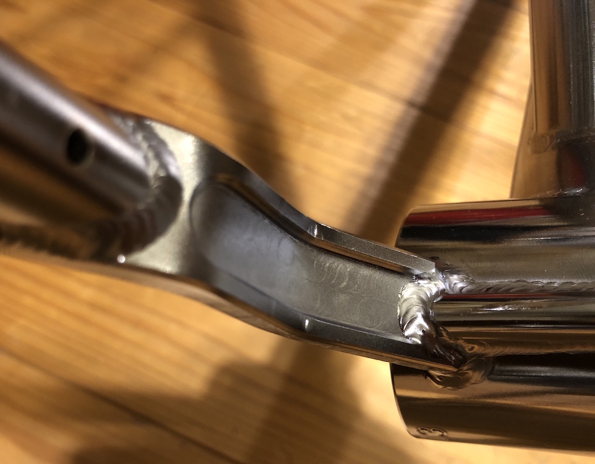 BBシェルに対して中心から少し下側に溶接することで、理想のBBハイトとチェーンステーの角度を実現(赤線)