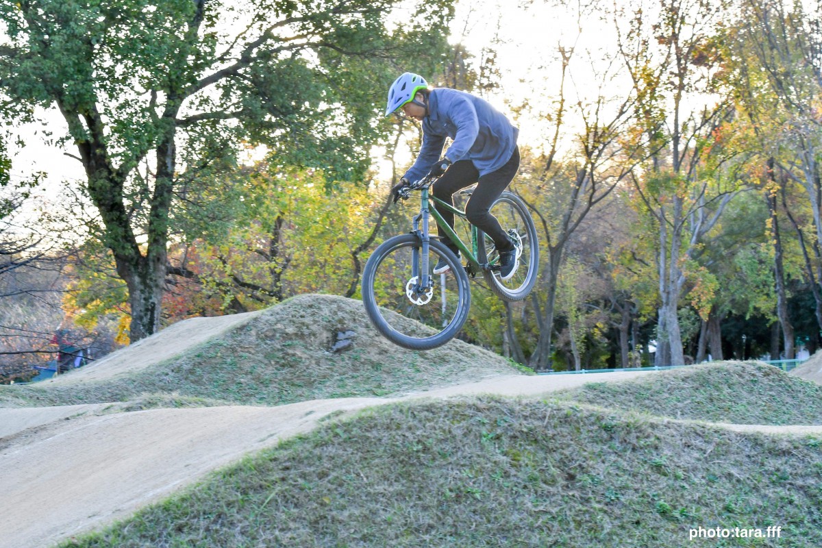 初めて29インチのマウンテンバイクでジャンプしたが大柄な車体に乗って飛ぶとBMXの時とは景色が違い迫力があり面白い。BMXや26インチのダートジャンプバイクのように軽やかではないが、逆に安定感があるので失敗しても転倒に繋がることは減りそうだ。