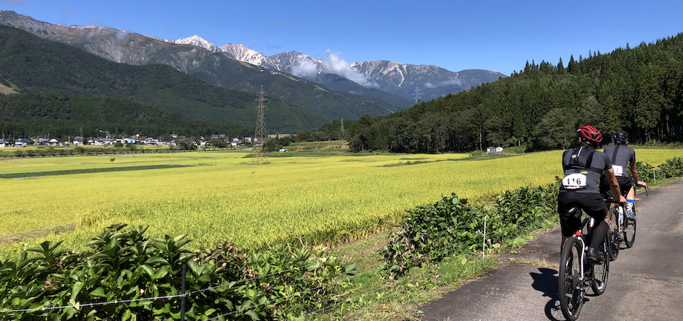 白馬の山々が連なり、あとは刈られるのを待つ全開の稲穂の横を走っていると、何とも言えない気持ちよさに包み込まれる。