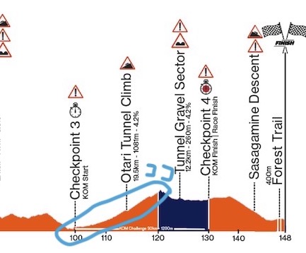 登ったり下ったりを繰り返し、最初の山場、戸隠クライム(12km/408m UP/3.4%)
