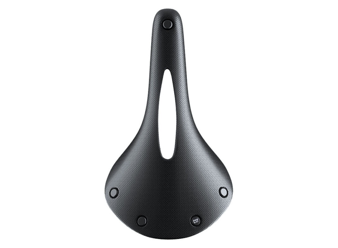 尿道圧迫を防ぐために凹みを作るサドルも多いですが、BROOKSはトップのしなりを出す目的で穴を開け、同時に圧迫からの開放も得ることができています。