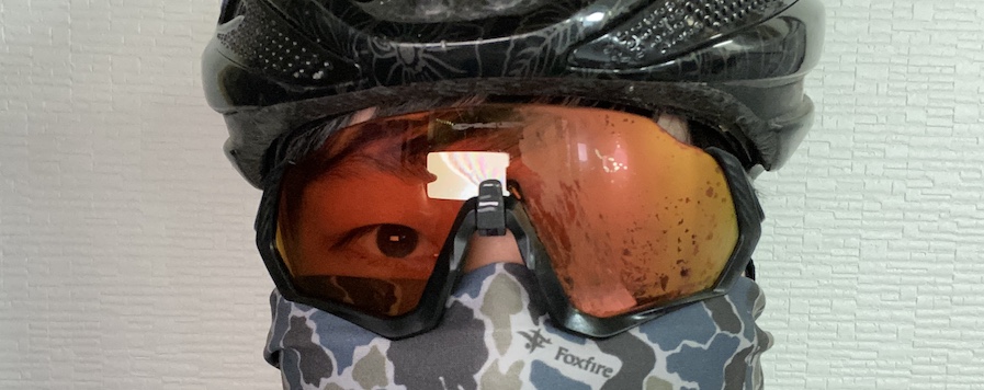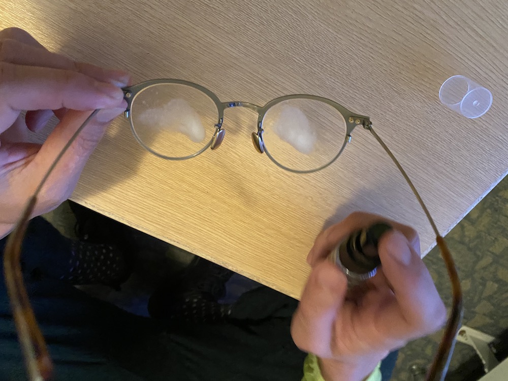 レンズ表面に汚れが付着していないことを確認し、レンズの両面にANTI FOG TREATMENTを吹きかけます。