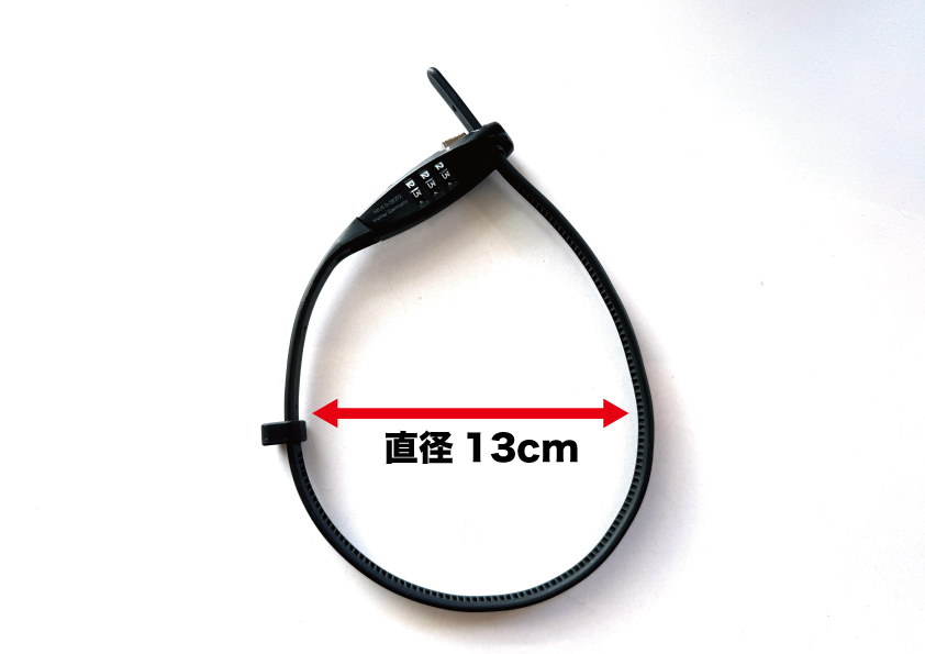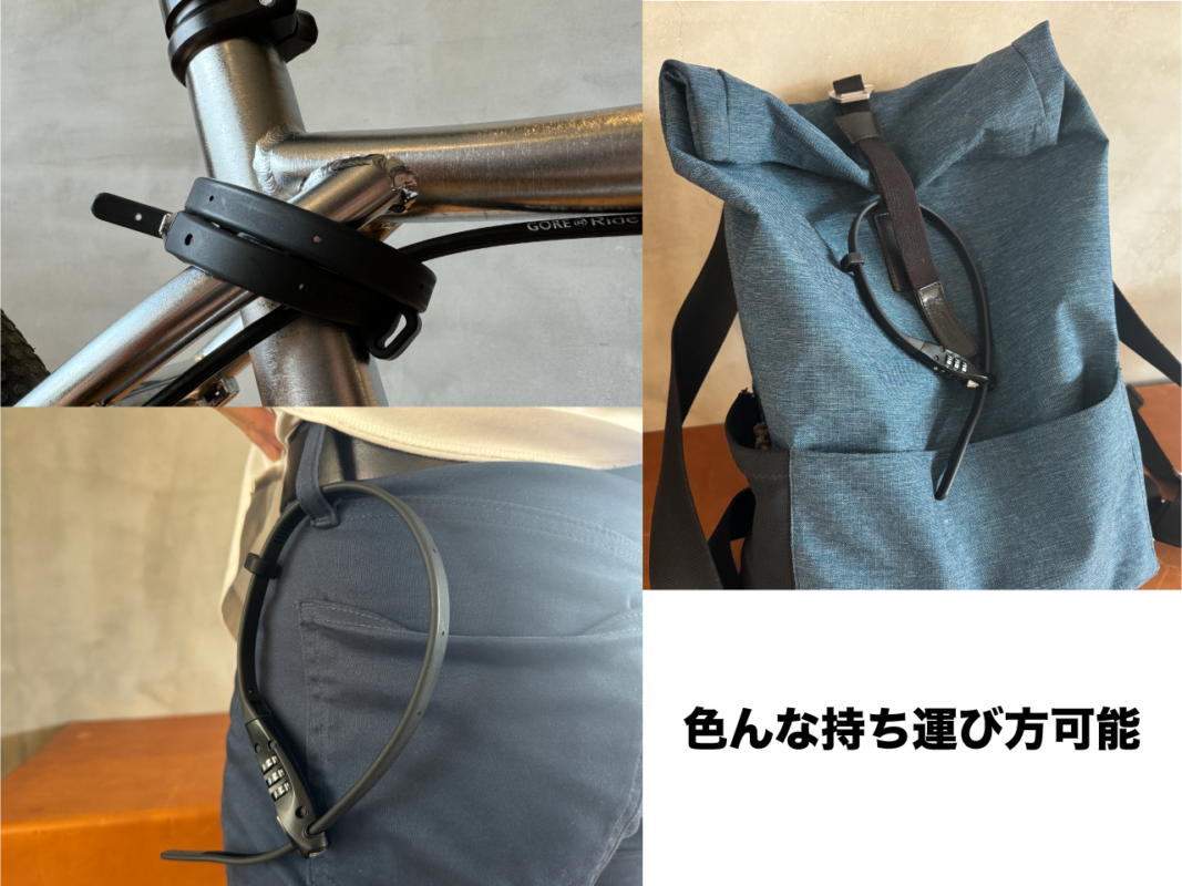 結束バンドのようにラチェットでカチカチ閉めていくタイプの新しい鍵です。 ロックする対象物に合わせて短くすることができるので、ぶらぶらしないのが特徴です。 また、3桁ダイヤル式なので、鍵が不要。 直径13cmで気軽に駐輪するには十分の長さです。 ハリのあるしっかりとした樹脂ボディと形状記憶の金属プレートなので、 薄い金属プレートなので、クリッパーのようなハサミでも切りづらいのが特徴です。 写真のように固定物とロックができます。 固定物とフレームの隙間をギュッと絞れるので、 コンパクトで軽量なロックなので、さまざまな持ち運び方ができます。 カバンのストラップやショルダー、ズボンのベルトループ、フレームへ巻きつけたり。 使い手次第で色んな持ち運び方ができます。スタッフ製品チェック