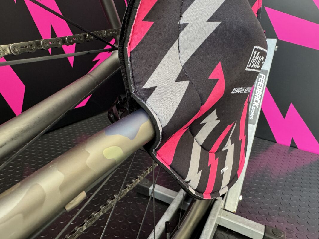 2分割式で周囲にマジックテープが縫われているので、シートステーやチェーンステー部も隙間なくピタッと密着することが出来ます。