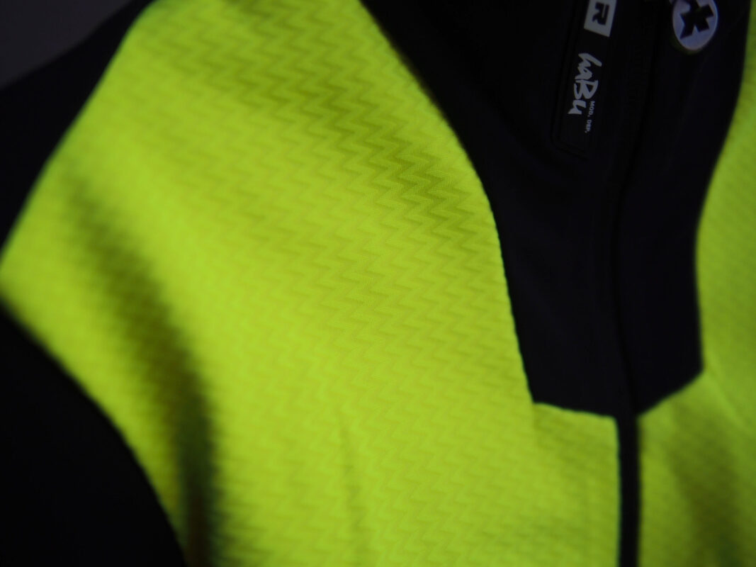 腹部と腕に使用されるNEOS Light(ネオスライト)は防風性と透湿性・撥水性に優れた特徴を持ちます。コンプレッション性のある生地で腹部を適度に圧迫しフィット感を維持しつつ