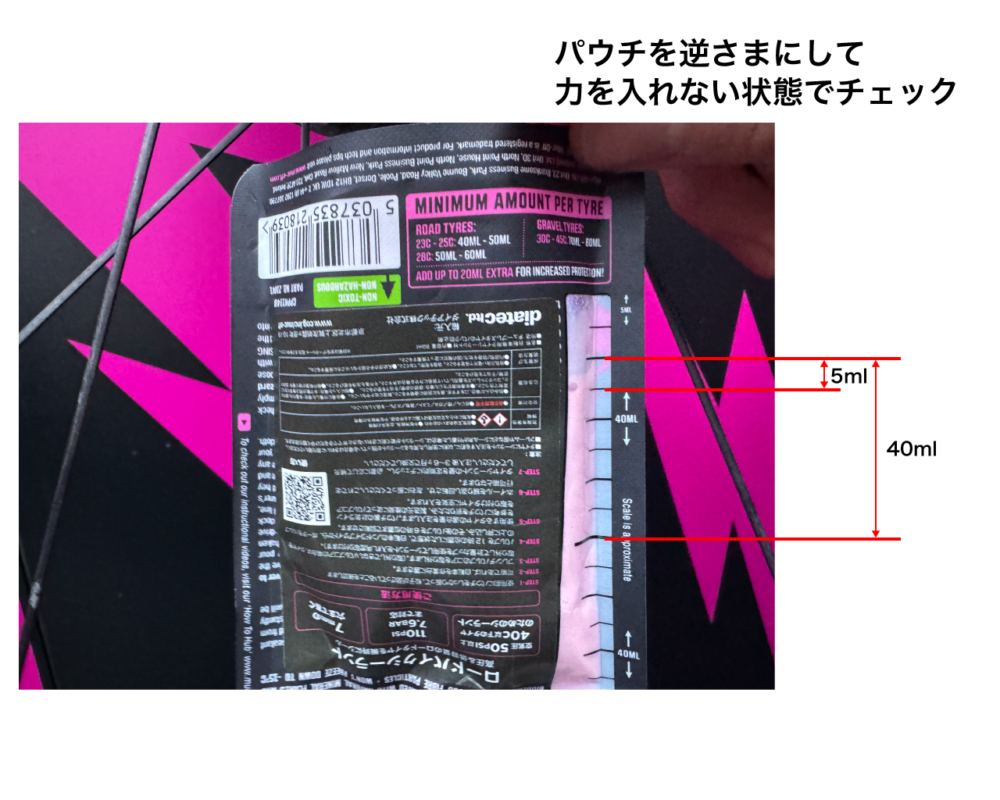 パウチタイプのシーラントの場合、パッケージ裏面の目盛りでシーラントをどれだけ入れたかをチェックすることが出来ます。