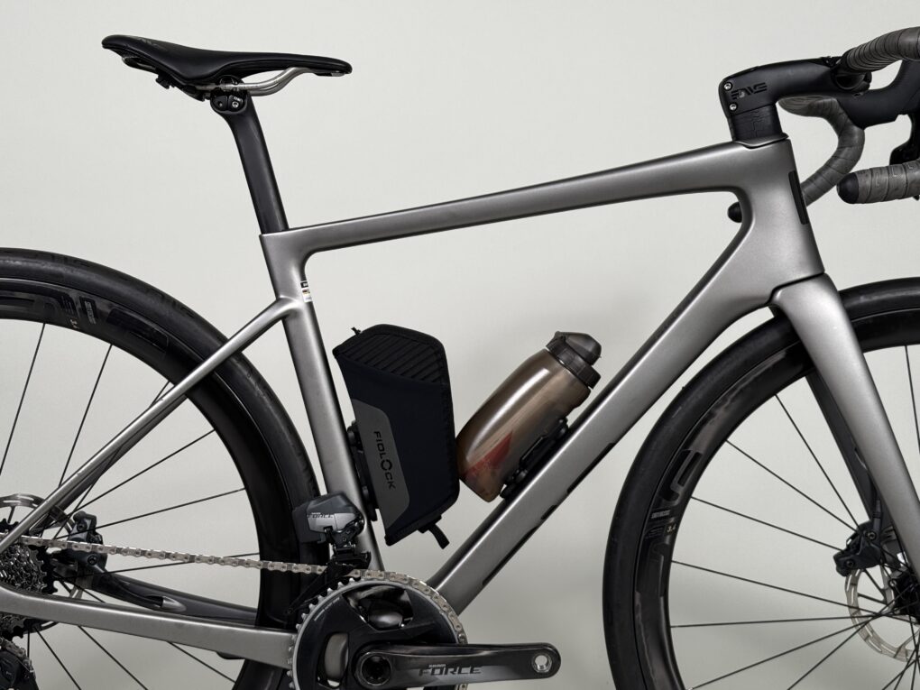 エッセンシャルバックをダウンチューブに取り付けシートチューブにボトルを取り付けるとフレーム内にピッタリ収まる設計です。