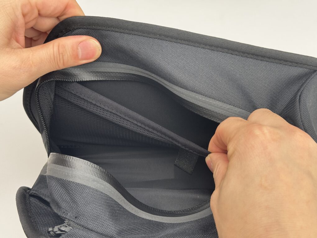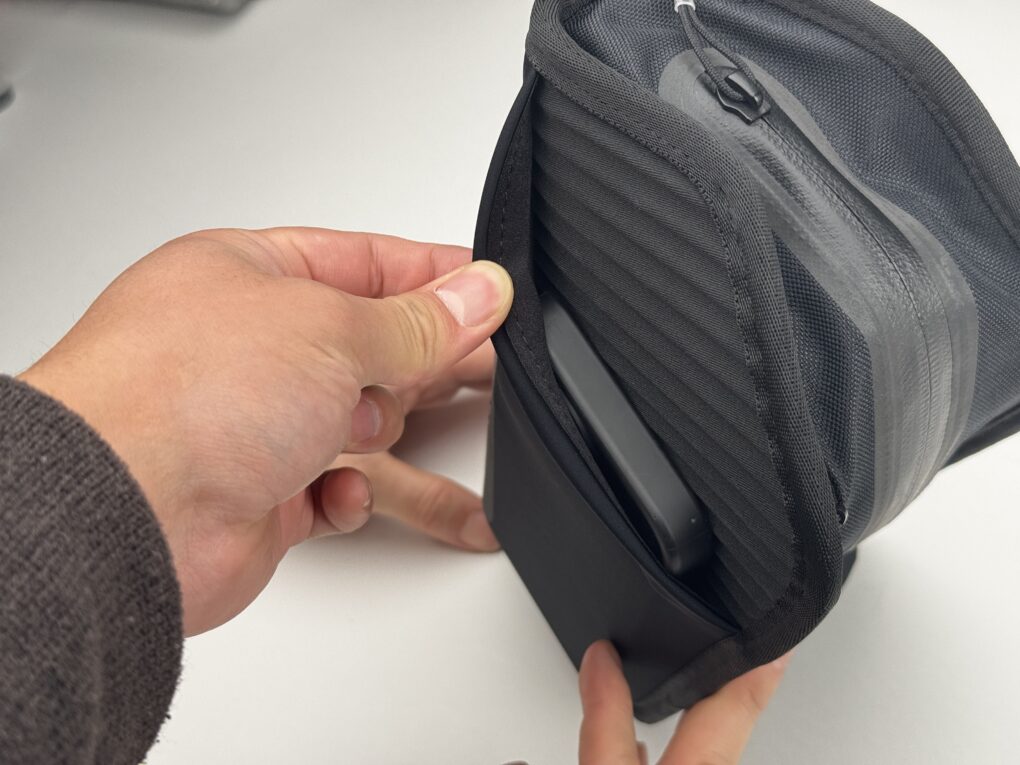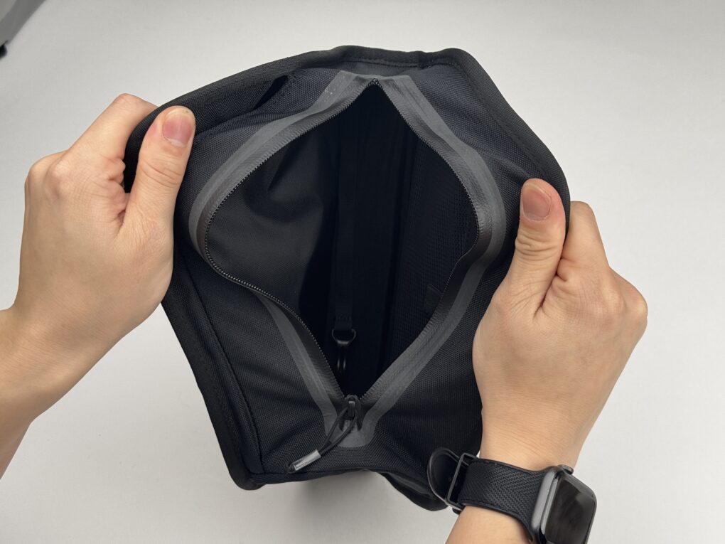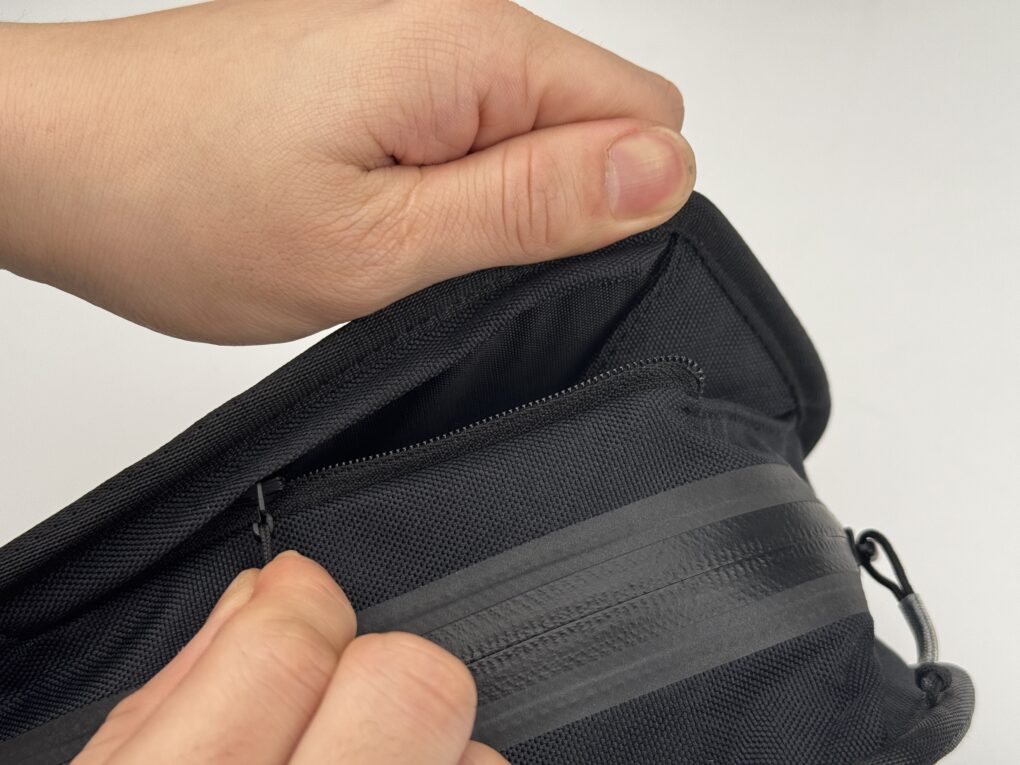 自転車から降りれば付属のストラップでショルダーバッグやヒップバックのように使用することができ、レインシェルなどを入れておけばライド中も、降りてからの散策でも常にそばに置いておくことができます。